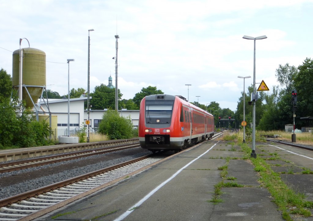 612 057 wurde hier bei der Durchfahrt durch den Bahnhof fotografiert, 11.07.2013. Der Triebzug war als RE Nürnberg-Hof unterwegs.