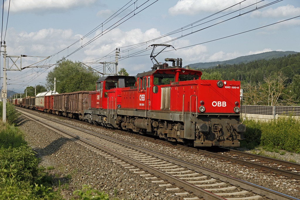 Am 11.07.2013 ziehen 1063 020 und 2068 022 gemeinsam den Verschubgüterzug 74655 bei Allerheiligen-Mürzhofen durchs Mürztal.