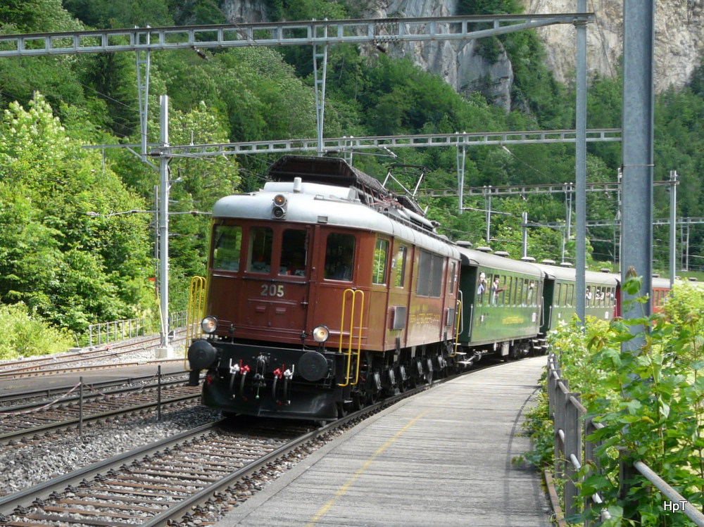 BLS / 100 Jahre Lötschbergbahn - Ae 6/8 205 mit Extrazug von Frutigen nach Kandersteg bei der durchfahrt im Bahnhof Blausee-Mitholz am 30.06.2013