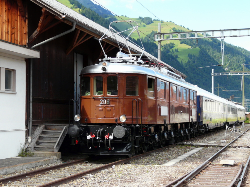 BLS / 100 Jahre Lötschbergbahn - Ae 6/8 208 mit Extrazug im Bahnhofsareal in Frutigen am 30.06.2013
