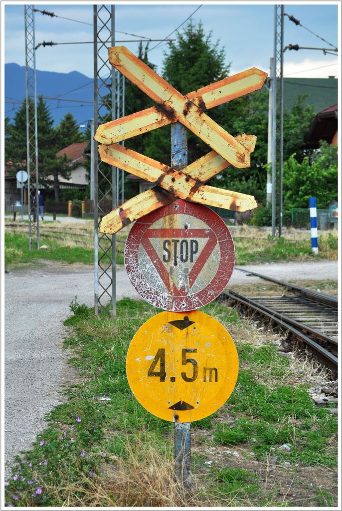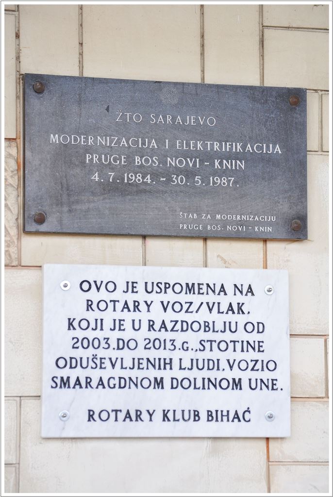 Die Tafeln am Bahnhof Bihać besagen, dass die Strecke von Bosanski Novi nach Knin zwischen 1984 und 1987 ausgebaut und elektrifiziert wurde. Es handelte sich dabei um die Hauptstrecke zwischen Split und Zagreb mit äusserst dichtem Zugsverkehr. Von alledem ist heute kaum mehr etwas zu sehen. Nach dem Krieg von 1991 verfällt die Romantische Strecke durch das Unatal in einen Dornröschenschlaf. Die Signalanlagen sind stillgelegt, die Fahrleitung teilweise abgebaut und Bahnübergangssignale entfernt. Ausser einem bescheidenen Güterverkehr nach Martin Brod verkehrt hier nur noch einmal im Jahr ein aussergewöhnlicher Personenzug des Rotary Club Bihać. Die zweite Tafel besagt, dass dieses Jahr das 10jährige Jubiläum des Zuges gefeiert werden konnte. (29.06.2013)