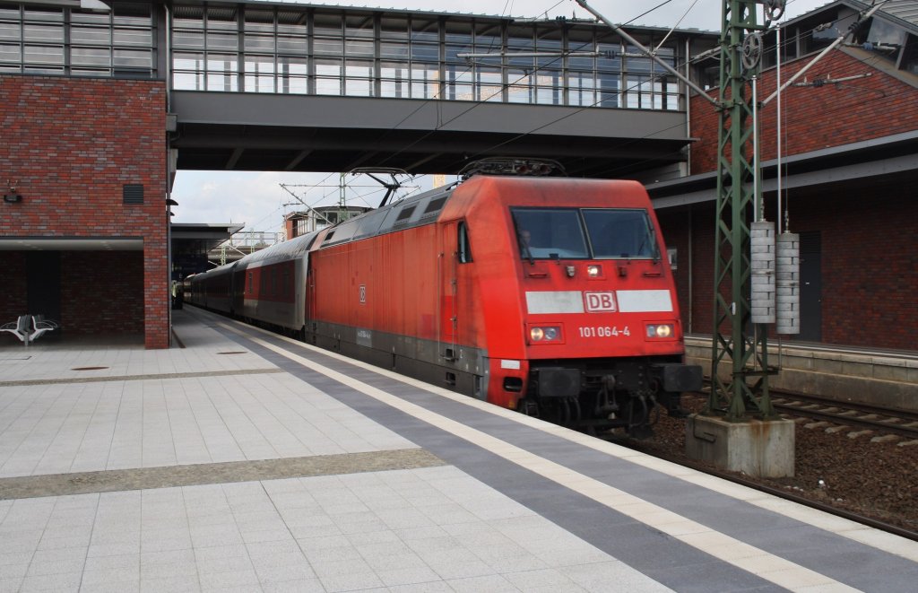 Hier 101 064-4 mit einem CNL-Leerpark, bei der Durchfahrt am 27.6.2013 durch Berlin Gesundbrunnen, in Richtung Berlin Rummelsburg.