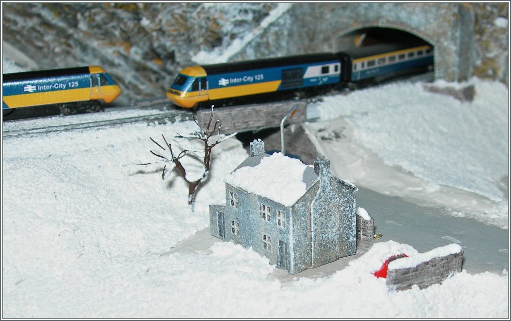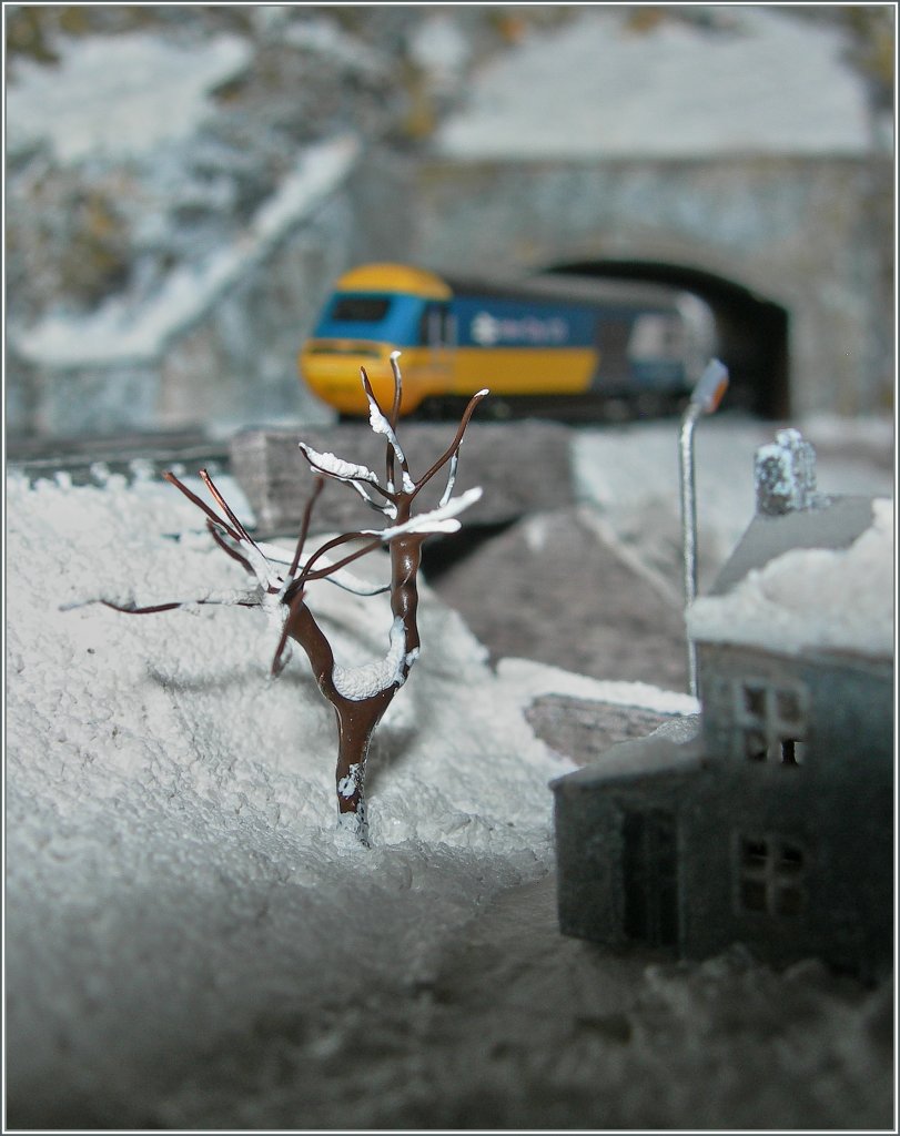 Wie Jeanny kürzlich richtig bemerkte, kann man unter dem "Schnee" so manches ungewollte verstecken. Doch im Gengenzug fallen die Laubbäume weg, die im Winter kahl sind und sich kaum zur Kaschierung eignen. (Die Schärfeebene liegt gewollt auf dem blattlosen Baum (Bildmotiv) und nicht auf dem Zug (Hintergrunddekoration)). T Gauge, Massstab 1:450 11. Juli 2013
