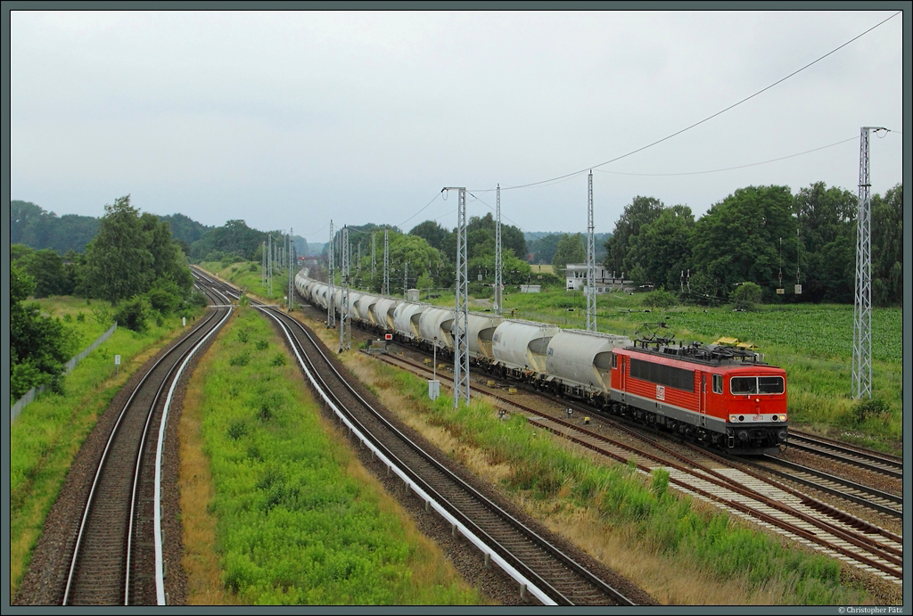 152 096-4 steht am 10. Juli 2013 zum Personalwechsel im Bahnhof Berlin Flughafen Schönefeld mit einem Kesselzug.