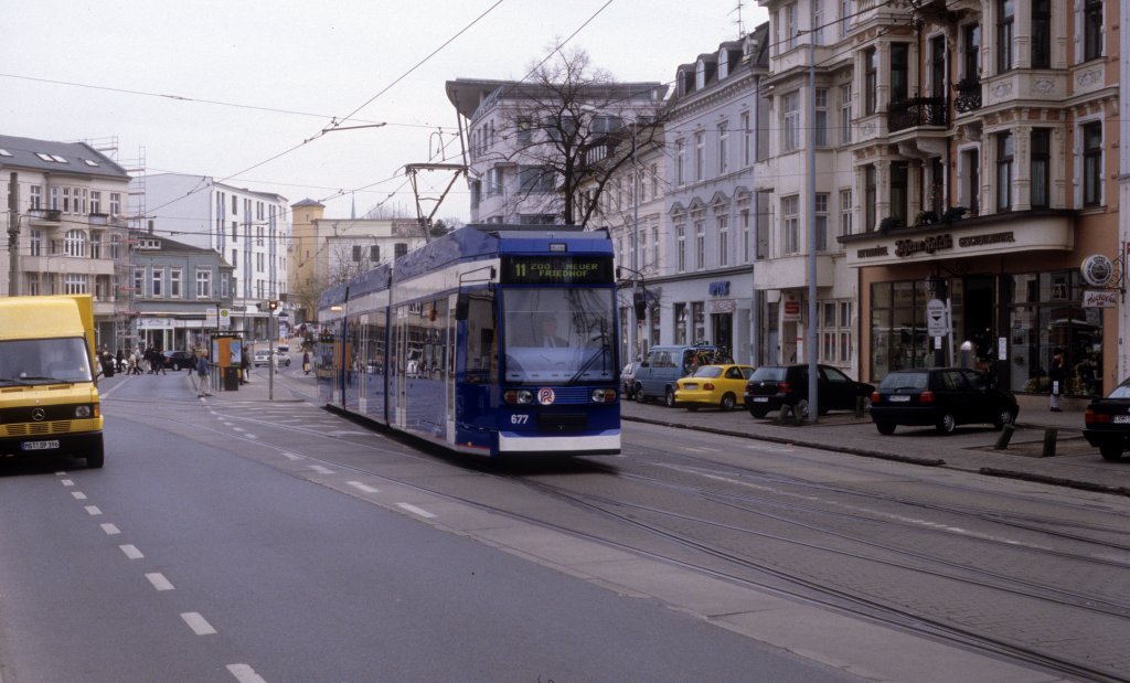 Rostock RSAG SL 11 (Düwag/DWA-6NGTWDE 677) Doberaner Platz / Wismarsche Strasse am 18. April 2000.