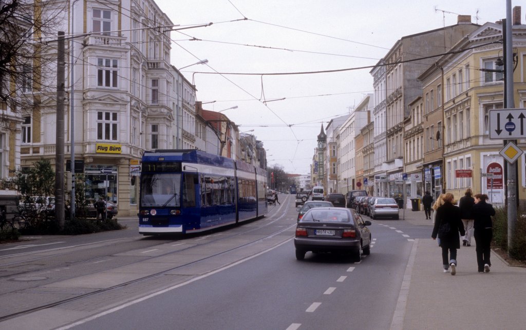 Rostock RSAG SL 11 (Düwag/DWA-6NGTWDE 687) Wismarsche Strasse / Am Brink am 18. april 2000.