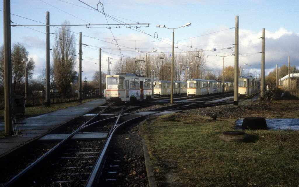 Rostock RSAG: Strassenbahnen in der Abstellanlage in Rostock-Marienehe am 14. November 1992.
