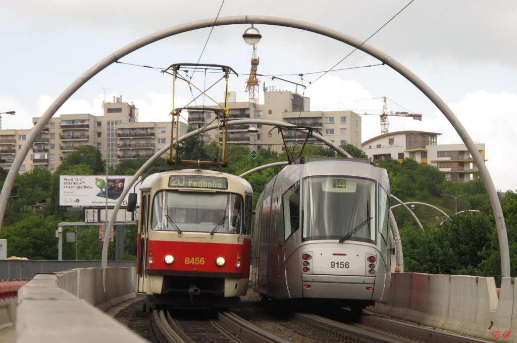 T3R.P 8456 + T3R.P und 14T 9156 auf der 760m langen Brücke der Neubaustrecke nach Sidliste Barrandov im Südwesten von Prag.(17.05.2012)