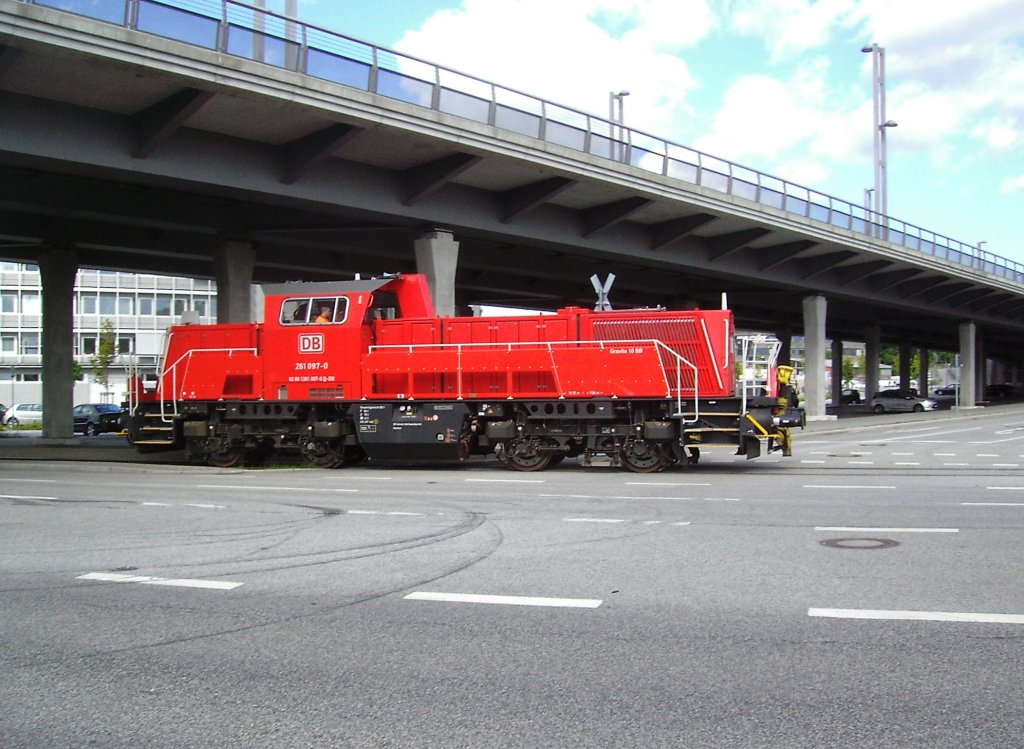 Verkehrsrot auf der Straße: die Gravita 261 097-0 unterquert am 10.07.2013 um etwa 17:00 Uhr auf der Rückfahrt von einer Übergabe an den Bollhörnkai die Gablenzbrücke in Kiel.