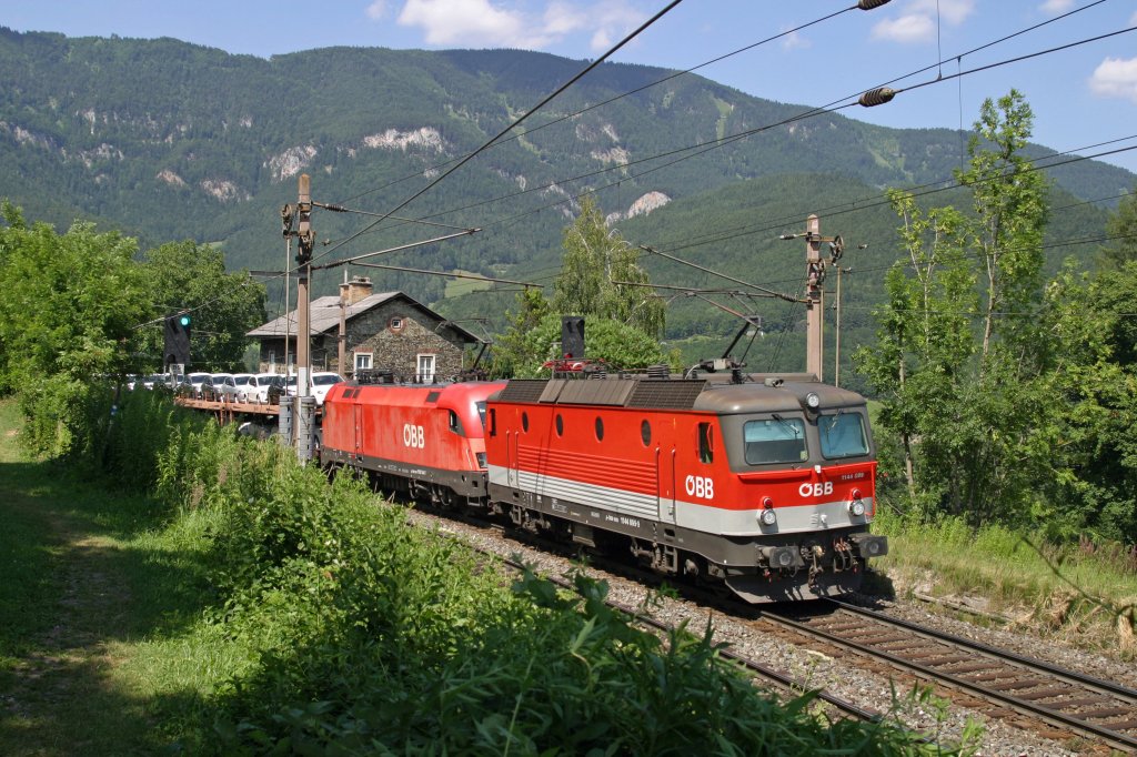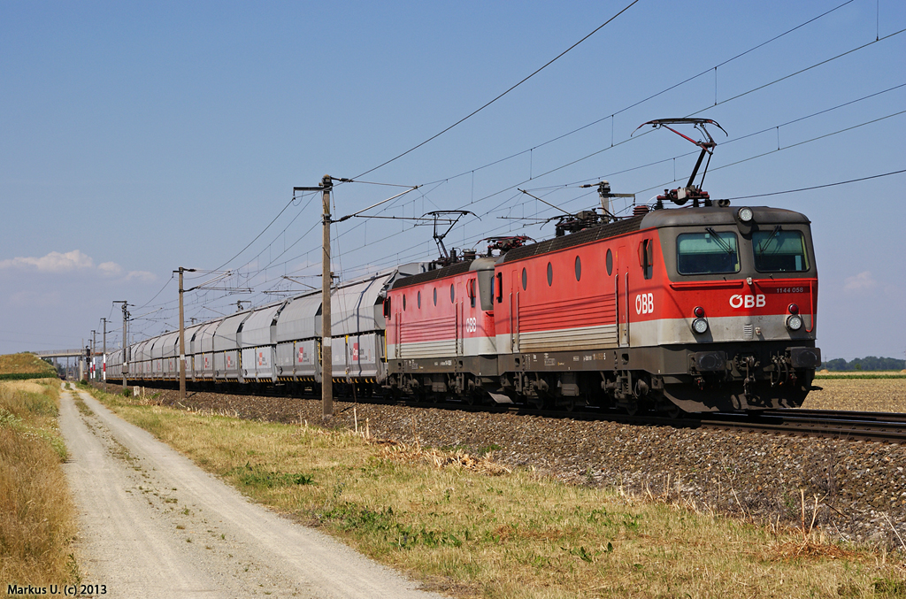 1144 058 + 1144 052 fahren mit RCA Talns GAG am 17.07.2013 bei Wampersdorf in Richtung Wiener Neustadt.