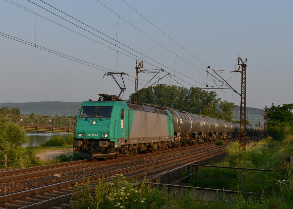 185 575 mit einem Kesselzug am 06.07.2013 bei Retzbach-Zellingen.