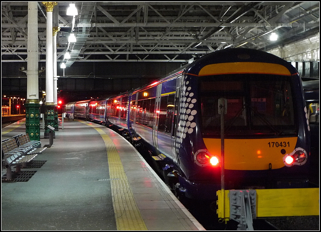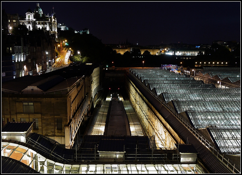 In einem Tal zwischen Old Town und New Town liegt die Station Waverley - der Hauptbahnhof von Edinburgh. Flächenmäßig der zweitgrößte Bahnhof Großbritanniens. 13.7.2013