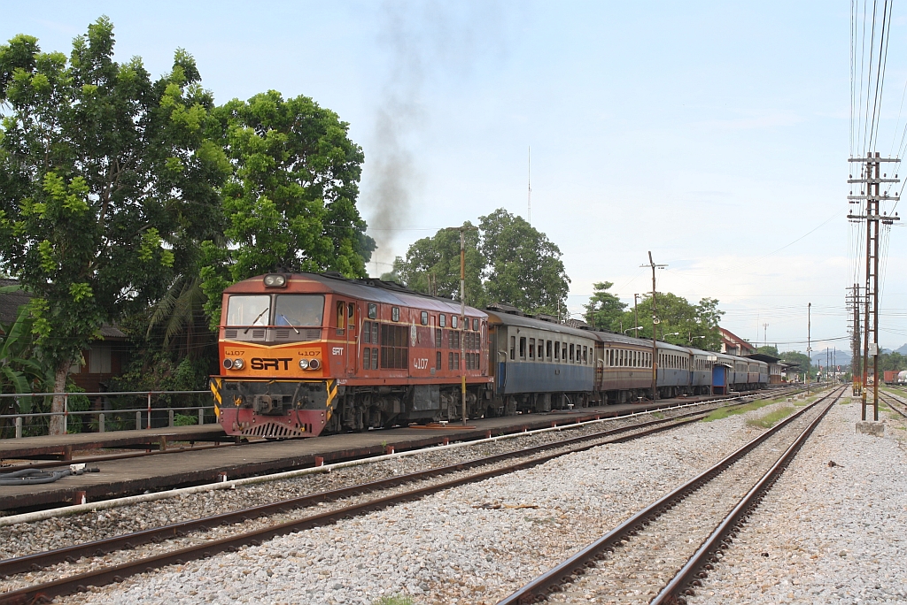 ALS 4107 (Co'Co', de, Alsthom, Bj.1974) verlässt am 18.Mai 2013 mit dem ORD 254 (Lang Suan - Thon Buri) und 60 min. Verspaetung den Bf. Chumphon.