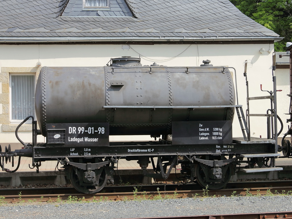 Anhänger für Ladegut Wasser der DR im Besitz der Harzer Schmalspurbahnen mit der Nummer 99-01-98 hier in Elend fotografiert.
