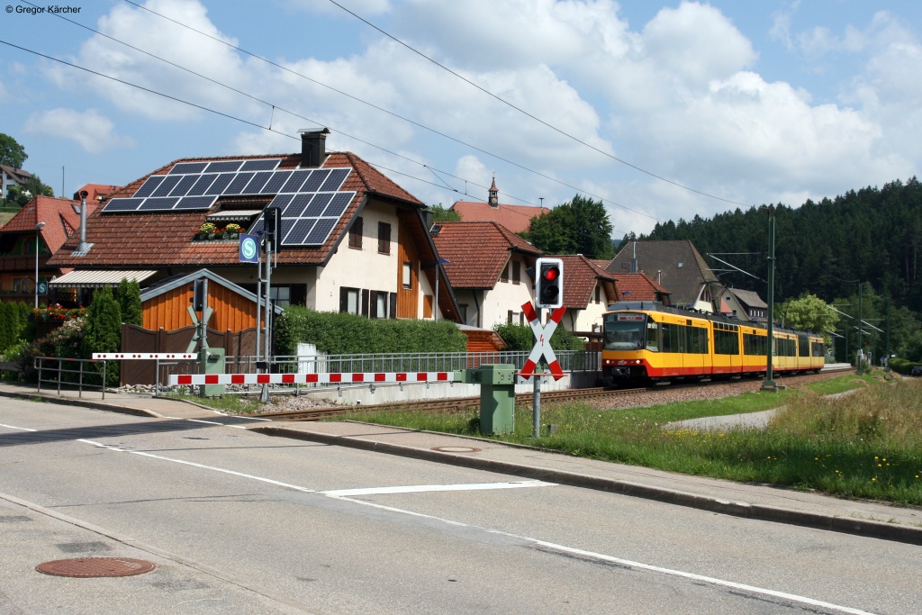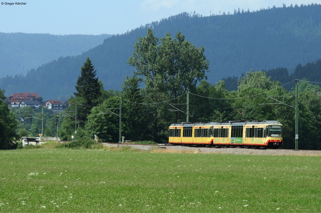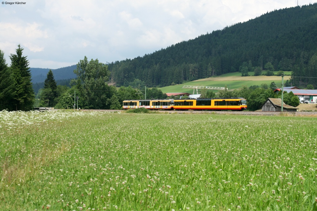 AVG ETW 877 und 8** als Eilzug nach Freudenstadt Hbf bei der Durchfahrt am Haltepunkt Röt. Aufgenommen am 07.07.2013.