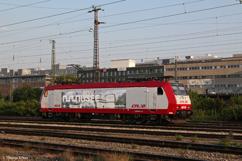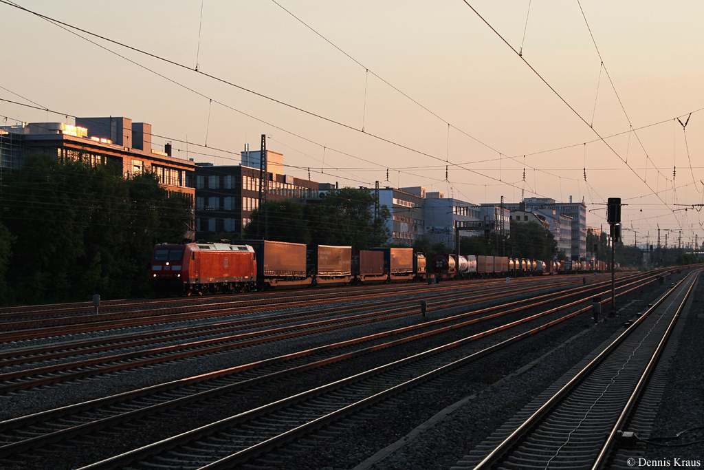 In den letzten Sonnenstrahlen des Tages fährt 185 067 mit einem Güterzug am 10.07.2013 bei München Laim ostwärts.