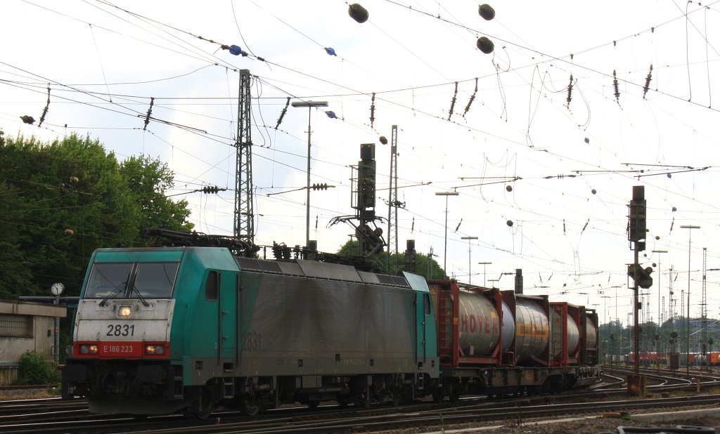 Die Cobra 2831 fährt mit einem langen Containerzug aus Gallarate(I) nach Antwerpen-Oorderen(B) bei der Ausfahrt aus Aachen-West und fährt in Richtung Montzen/Belgien bei Sonne und Wolken am 29.6.2013.