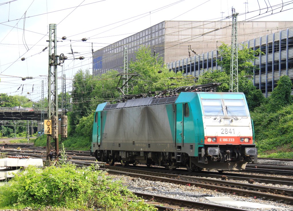 Die Cobra 2831 fährt mit einem langen Containerzug aus Gallarate(I) nach Antwerpen-Oorderen(B) bei der Abfahrt aus Aachen-West und fährt in Richtung Montzen/Belgien bei Sonne und Wolken am 29.6.2013.
