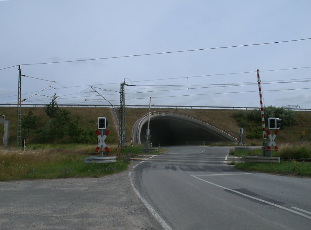 Dieser Bahnübergang befindet sich in der Nähe von Stralsund,an der Strecke Stralsund-Berlin)unterhalb vom Rügenzubringer.Aufgenommen am 14.Juli 2013.