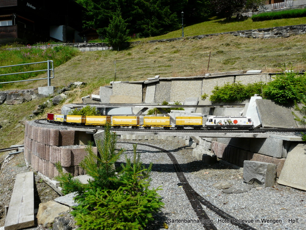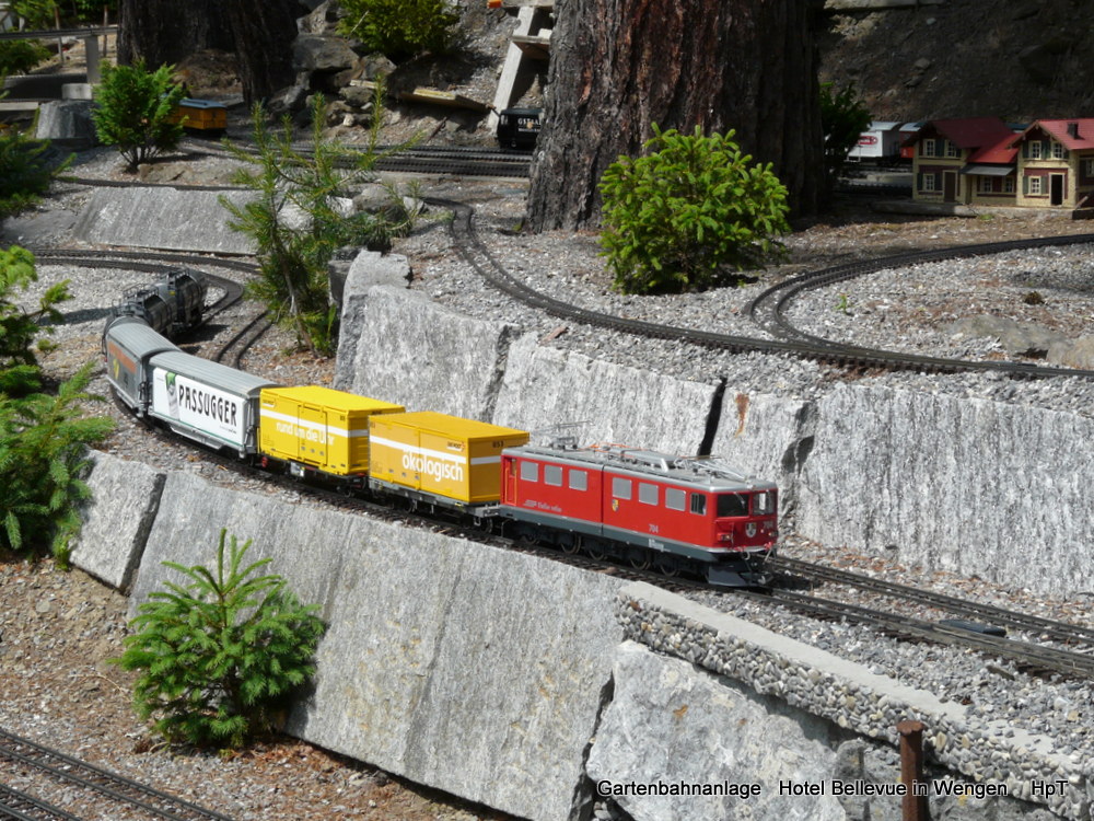 Gartenanlage Hotel Bellevue in Wengen - KISS RhB Ge 6/6 704 mit Güterzug unterwegs am 13.07.2013