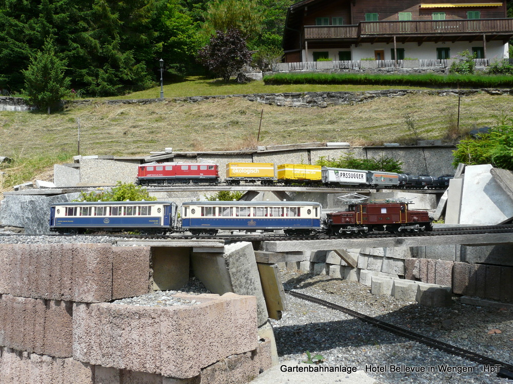 Gartenanlage Hotel Bellevue in Wengen - LGB / KISS - RhB Ge 6/6 412 mit Personenwagen und Ge 6/6 704 mit Güterzug unterwegs am 13.07.2013