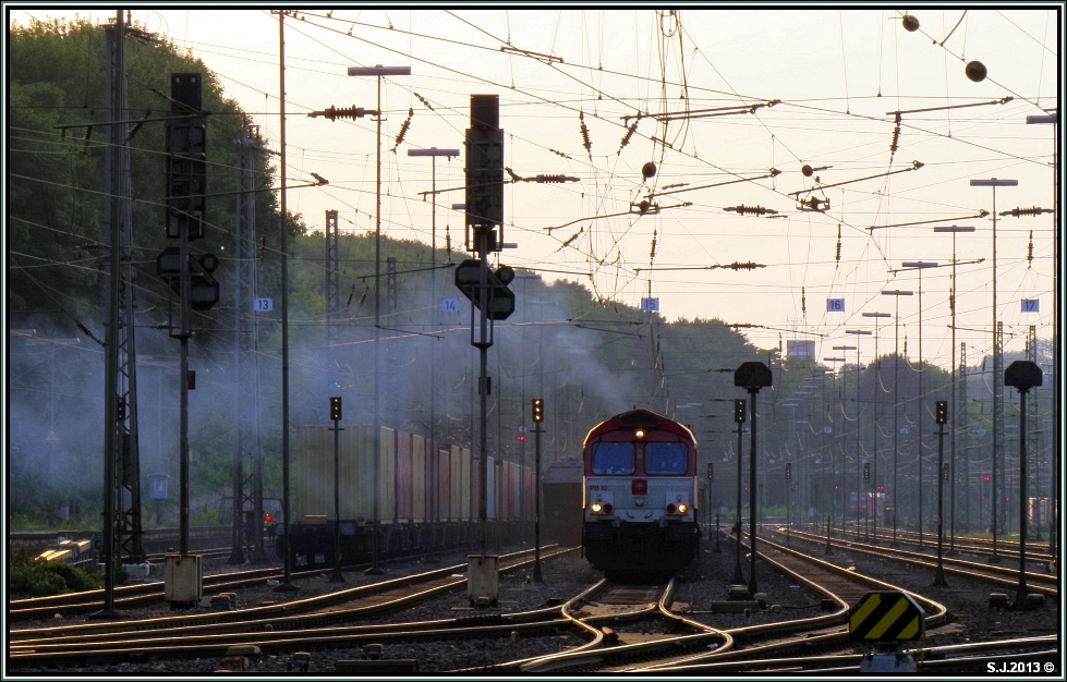 Nein! Kein Plandampf. Diese Crossrail Class 66 zieht an ihrer schweren Last,ein Containerzug.Gleich geht es hinauf nach Belgien auf die Montzenroute. Bahnszenario aus Aachen West im Juli 2013.