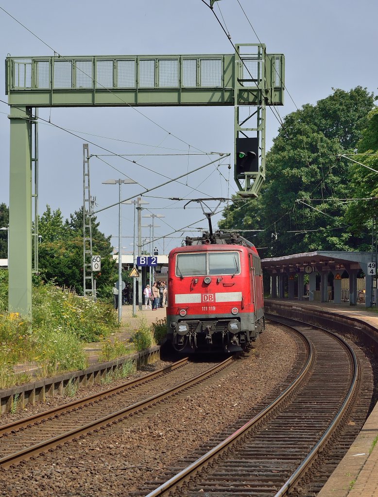 Noch ein Nachschuß! Diesmal hat es die 111 119 in Rheydt am Bahnsteig Gleis 2 getroffen als sie am Sonntag den 14.7.2013 einen RE4 Zug nach Dortmund schob.