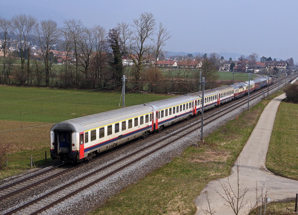 SBB/B: SBB-Wagen in Belgien, B-Wagen in der Schweiz. Gleich mehrere belgische Wagen waren in einem Sonderzug eingereiht am 2. April 2013 mit der BLS Re 425 188 zwischen Grenchen und Solothurn unterwegs.