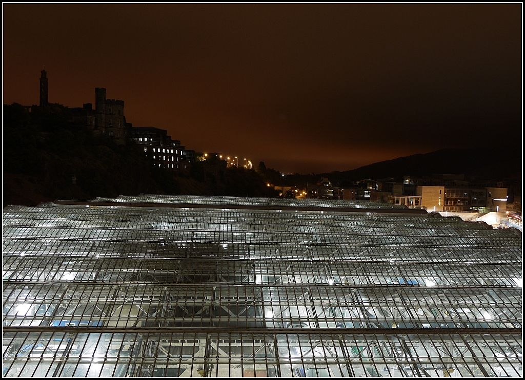Sieht aus wie ein riesiges Gewächshaus: der Hauptbahnhof von Edinburgh bei Nacht. 14.7.2013