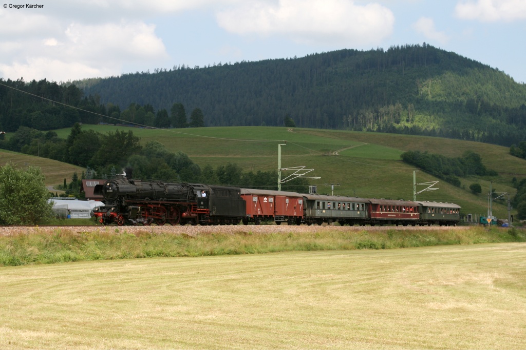 Weil die 58 311 wegen einem Lokschaden außer Betrieb war, sollte der Sonderzug mit einer Diesellok durch das Murgtal nach Baiersbronn fahren. Doch einen Abend vor der Fahrt konnte die 01 1066 für die 58 311 einspringen. 01 1066 mit dem Sonderzug Karlsruhe-Baiersbronn bei Röt am 07.07.2013.