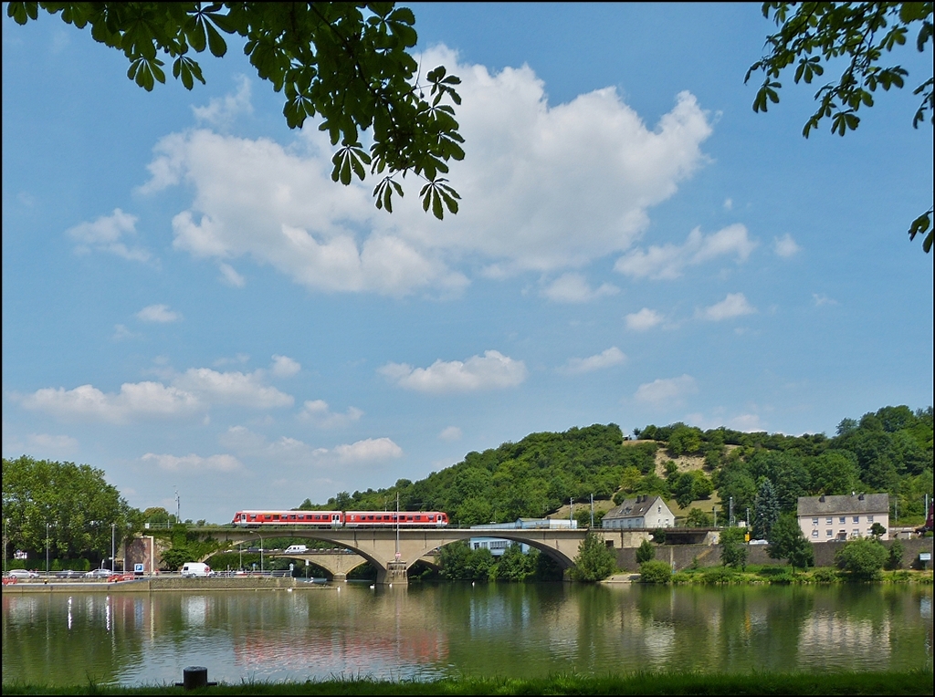 . Sommer an der Mosel - Nur selten fließt das Wasser der Mosel so sanft dahin, dass sich eine angedeutete Spiegelung ergibt, als der RE 5213 Luxembourg - Trier Hbf über die Sauerbrücke in Wasserbillig fährt. 16.07.2013 (Jeanny)