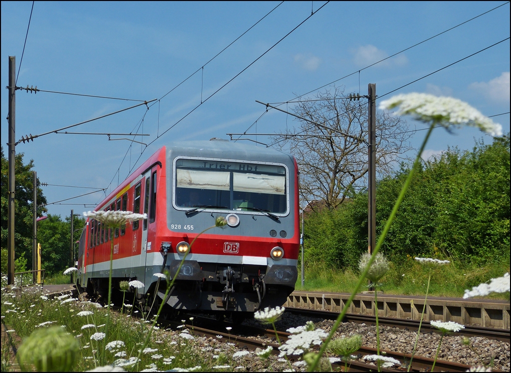 . Sommerzeit ist Blumenzeit - Die wilden Möhren tanzen im Wind, als der RE 5211 Luxembourg - Trier Hbf ohne Halt durch den Bahnhof von Mertert dieselt. 16.07.2013 (Jeanny)