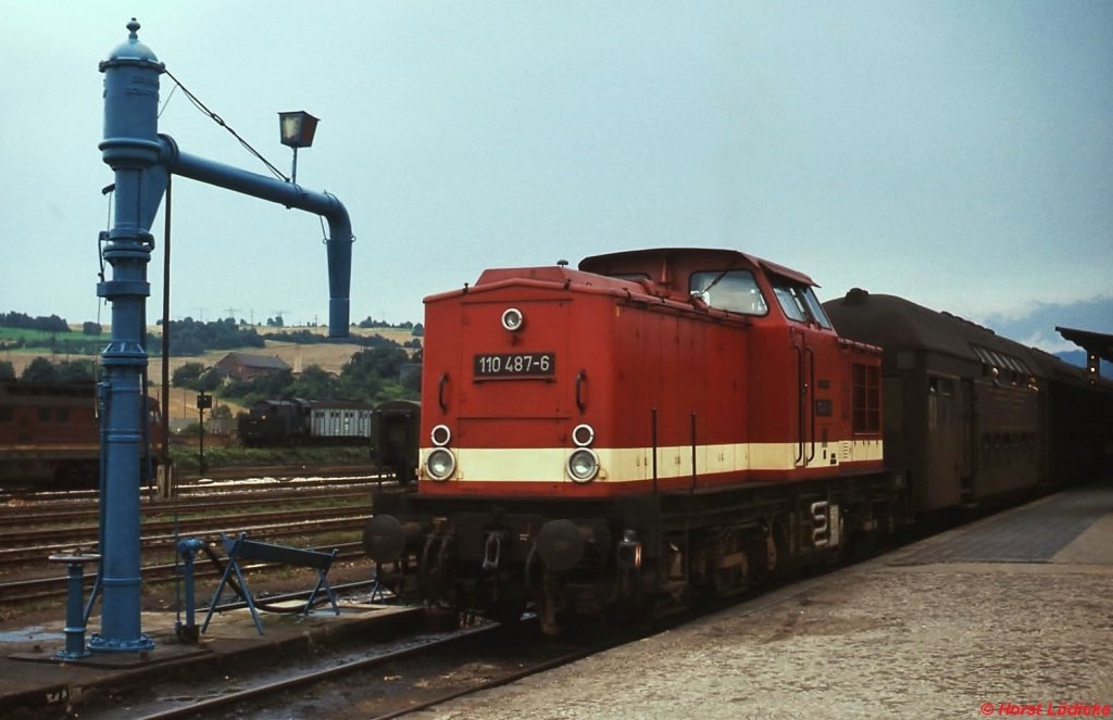 110 487-6 vor einer Doppelstockwagengarnitur im Bahnhof Saalfeld (Oktober 1980)