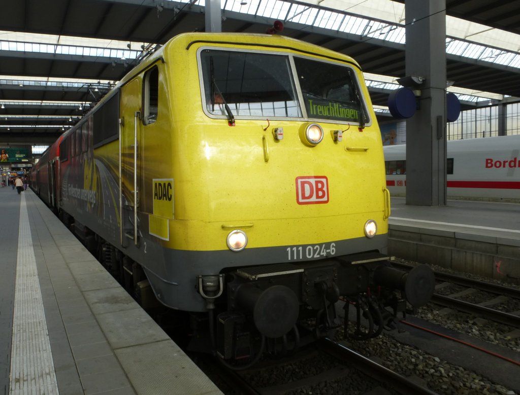 111 024-6 "ADAC" steht hier mit dem RE München-Treuchtlingen in seinem Startbahnhof, 23.05.2013.
