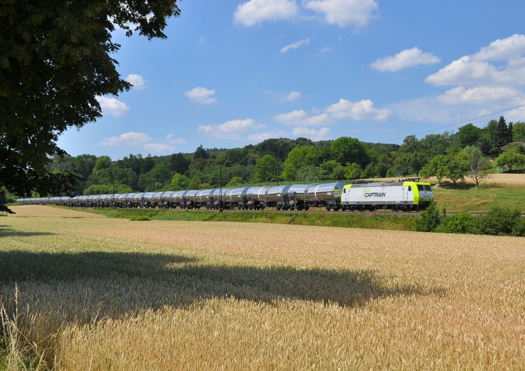 185 550 von Captrain mit Nagelneuen Kesselwagen auf der Filsbahn in Richtung München.Aufgenommen bei Ebersbach(Fils)am 20.7.2013