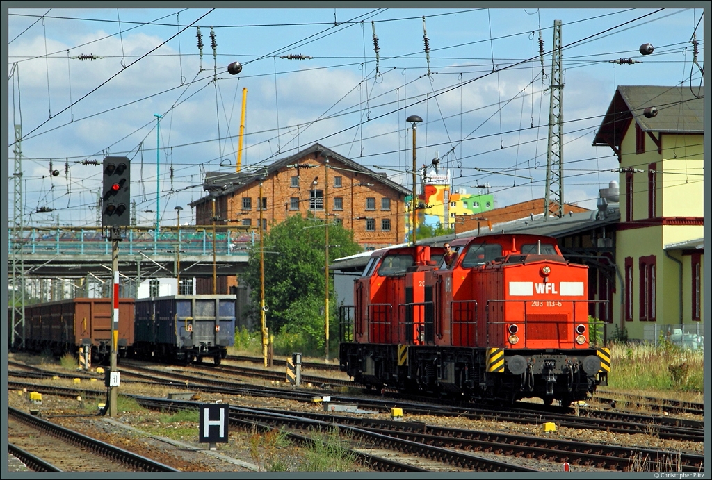 203 113-6 mit einer weiteren V100 der WFL beim Umsetzen im Bahnhof Neubrandenburg. (17.07.2013)