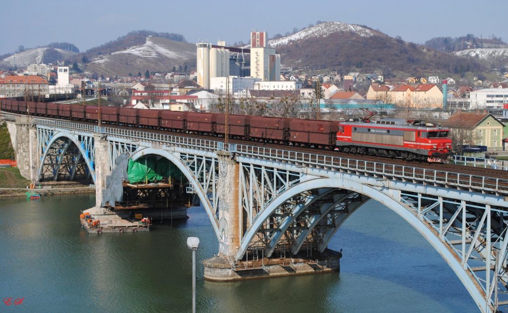 Stromlos rollt dieser Güterzug auf dem Göhltalviadukt bei Moresnet (B) unter die Trennstelle. Gleich heißt es wieder ,Bügel hoch,diesmal der für das deutsche Stromnetz.So gesehen im November 2012.