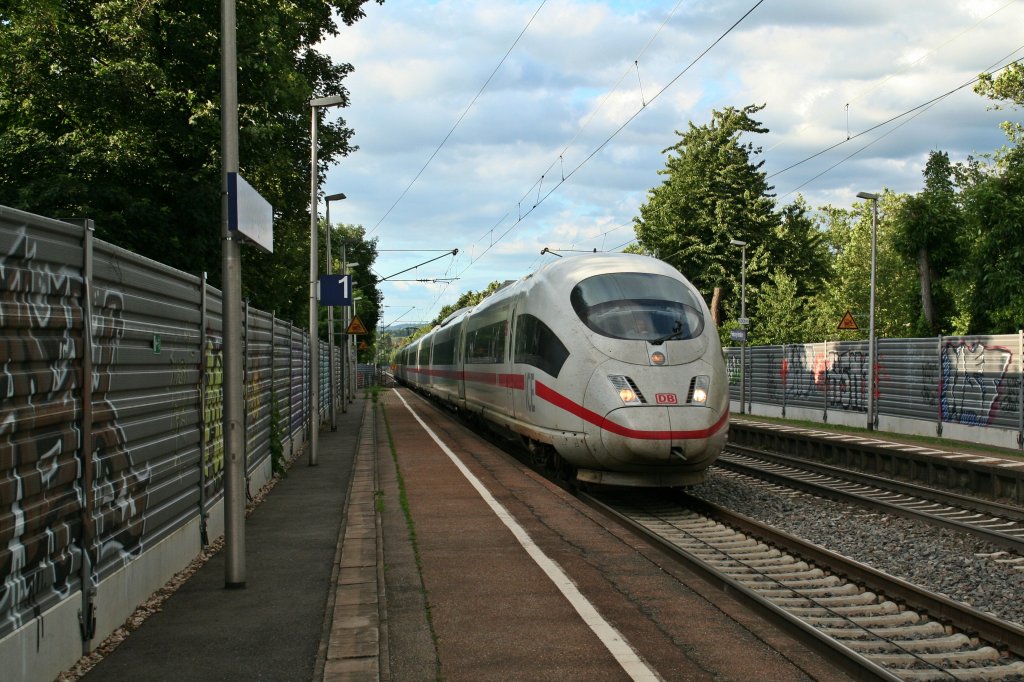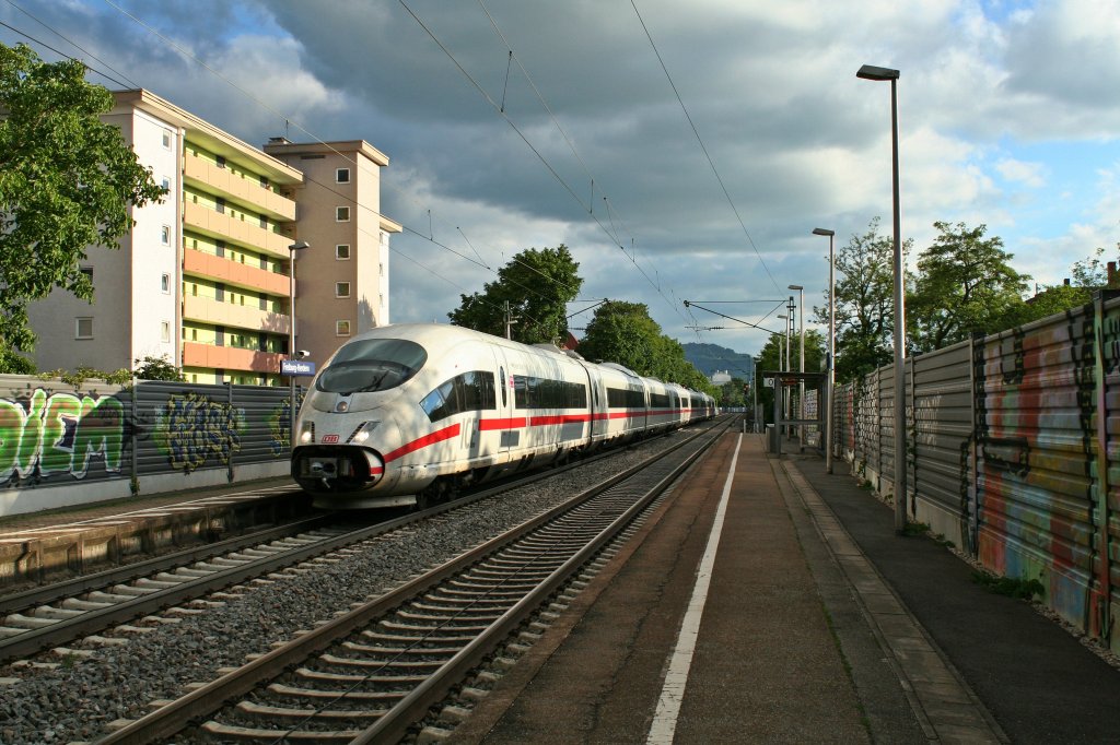 403 518-4 als ICE 100 nach Dortmund am Abend des 22.06.13 bei der Durchfahrt des Freiburger Stadtbahnhofs und gleichnamigen Stadtteils Herdern.