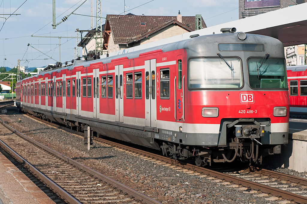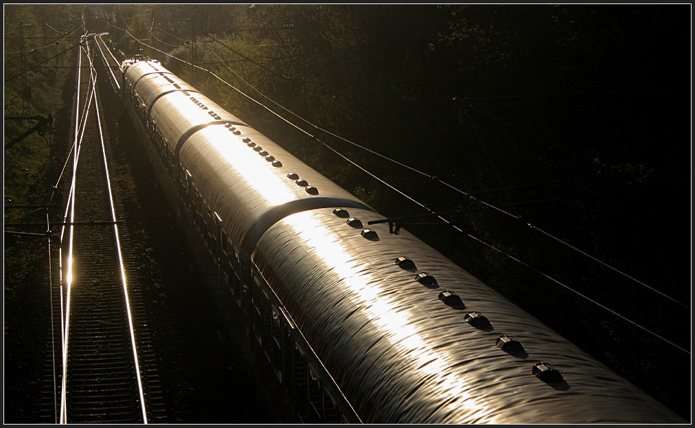 Der Regional-Express-Verkehr auf der Remsbahn wird zu einem großen Teil noch mit altem Wagenmaterial gefahren (auch noch 2013, das Bild ist von 2007). Hier bei Rommelshausen, abends als die tiefstehende Sonne direkt über den Gleisen stand.