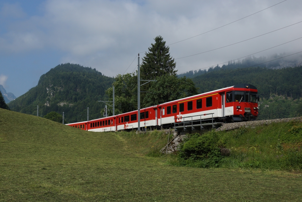 Am 07.07.2013 wartete ich unterhalb von Brünig-Hasliberg auf den talwärts fahrenden IR 2241 , welcher zurzeit noch mit einer "normalen" Komposition geführt wird. Leider befand sich an der Spitze des Zuges keine HGe 101, sondern der Steuerwagen ABt 930-7.