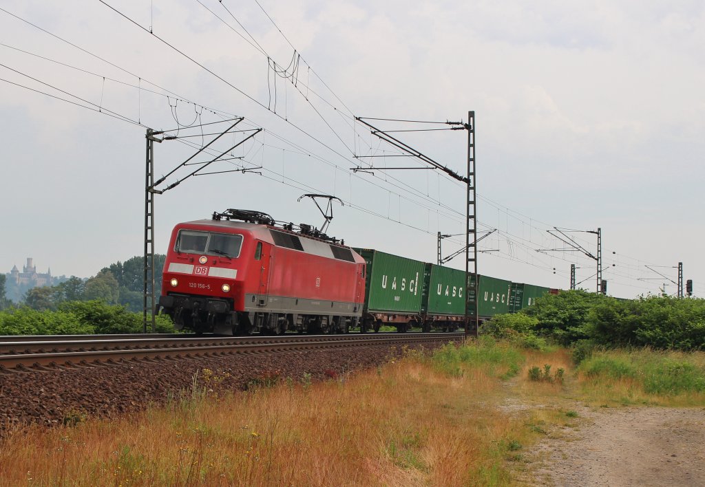 Am 19.Juni 2013 war 120 156 mit einem Containerzug bei Burgstemmen (KBS 350) auf dem Weg Richtung Süden.