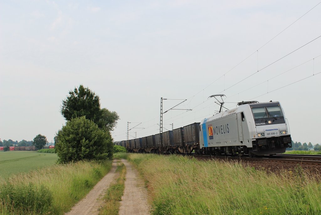 Am 19.Juni 2013 war Transpetrol 185 696 mit dem Novelis-Zug bei Burgstemmen auf dem Weg nach Nievenheim.