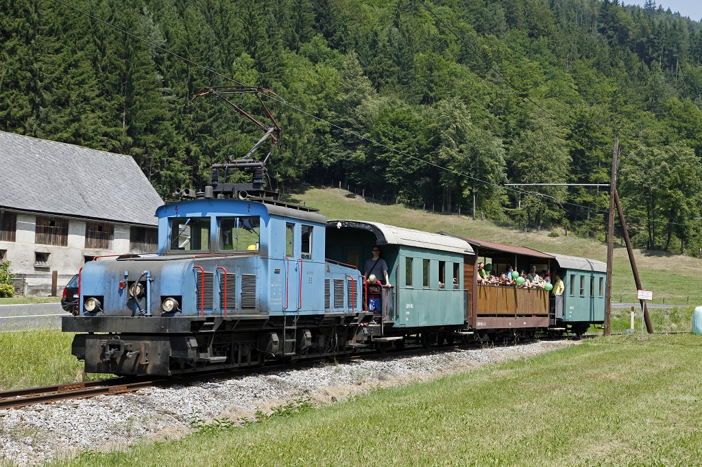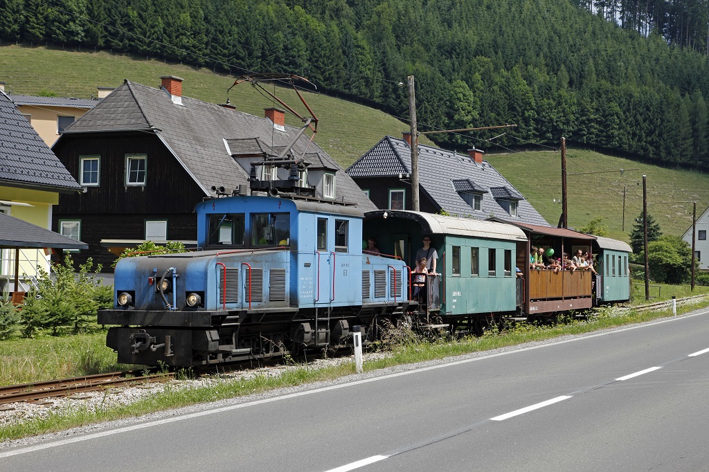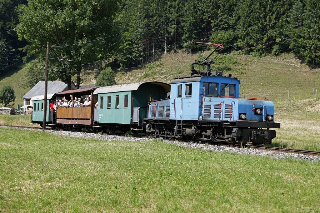 Am 20.07.2013 fand der vierte Betriebstag der Breitenauerbahn in der Saison 2013 statt. Die E3 pendelte an diesem schönen Sommertag fünfmal durchs Breitenauertal. Das Bild zeigt den Zug bei Mautstatt.