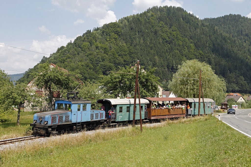 Am 20.07.2013 fand der vierte Betriebstag der Breitenauerbahn in der Saison 2013 statt. Die E3 pendelte an diesem schönen Sommertag fünfmal durchs Breitenauertal. Das Bild zeigt den Zug im Roßgraben.