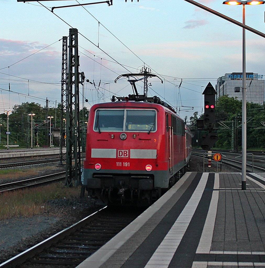 Am Abend des 24.05.2013 schob die Frankfurter 111 191 einen RE nach Heidelberg Hbf. Hier ist der Regionalzug bei der Ausfahrt aus dem Hauptbahnhof von Damrstadt gen Süden.