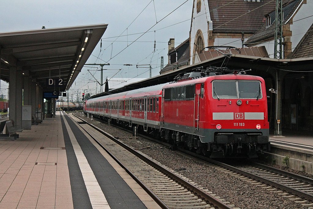 Ebenfalls am 24.05.2013, 111 192-1 mit einem RE nach Weinheim bei der Ausfahrt aus Darmstadt Hbf gen Süden.