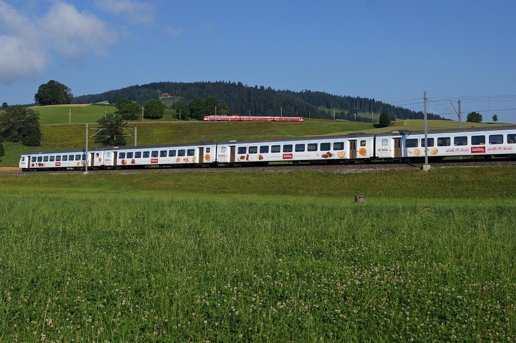 BLS: Zufällige Begegnung von BLS-Zügen auf unterschiedlichen Strecken. RABDe 566 220-227 auf der Fahrt nach Grosshöchstetten. "KAMBLY-ZUG" auf der Fahrt nach Bern. Die Aufnahme mit den beiden "EXOTEN" ist wegen kleinen Zugsverspätungen am 20. Juli 2013 bei Mirchel entstanden.