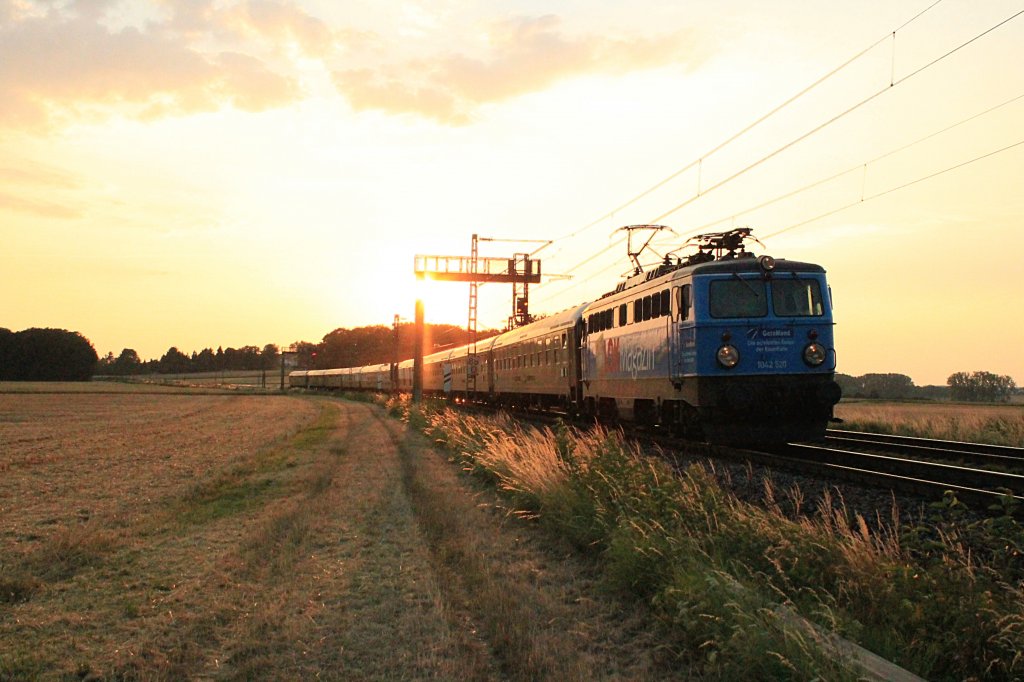 Der Classic Courier mit Zuglok 1042 520 ist nach langer Fahrt bald am Ziel in München. Hier im letzten Abendlicht kurz hinter Gaimersheim am 18.07.2013.