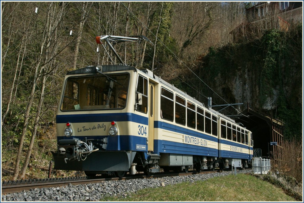 Der Rochers de Naye Beh 4/8 304 verschwindet gleich im 386 langen Valmont Tunnel.