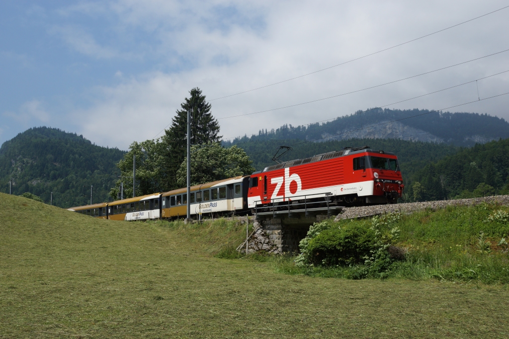 Die Landschaft macht es möglich, dass ich am 07.07.2013 eine reine Golden-Pass Kompositition mit der HGe 101 966-0 an der Spitze aufnehmen konnte. Natürlich folgten nach den drei ersten Wagen noch weitere, im Zentralbahn-Look lackierte Wagen. Das Bild wurde unterhalb von Brünig-Hasliberg aufgenommen.